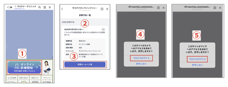 ※診察時間前は、入室ボタンが押せない場合がございます④「カメラ」使用許可のポップアップが表示されたら、[許可] を押す