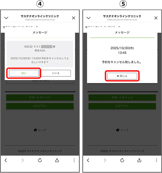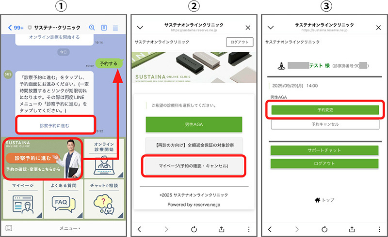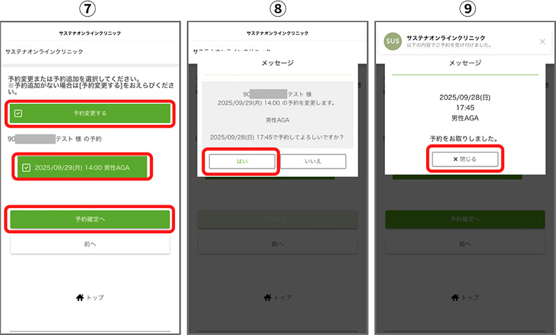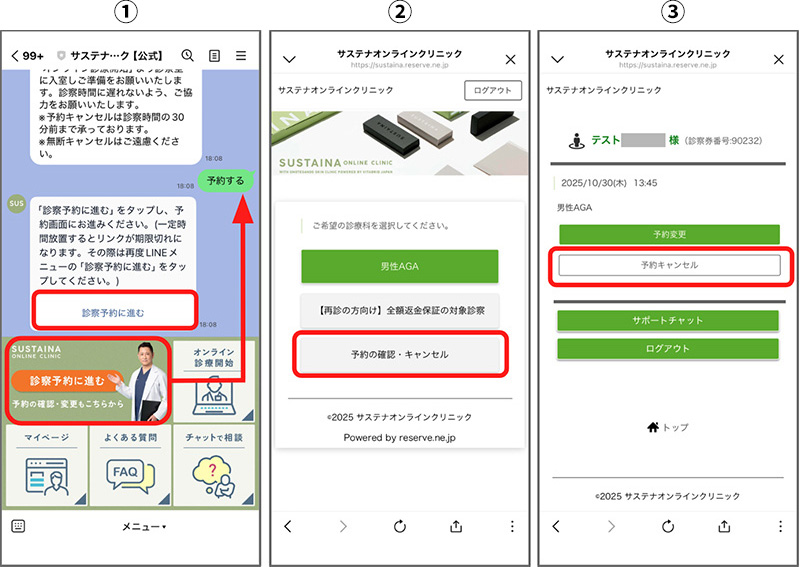 - メールまたは、SMSよりお送りした予約ページよりご変更やキャンセルが可能です。