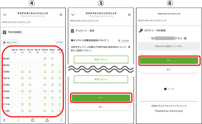 ⑤アンケート・問診内容を確認して、[次へ]を選択